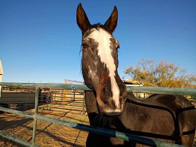 She is a Holsteiner mare in her mid-20's. Dalai belonged to an elderly couple who could no longer care for her. She has a grade 4 heart murmur. She is a kind soul, loves everyone here.