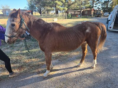 Nugget is a tiny miniature horse, picked up as a estray and now at Dharmahorse to heal. He is in his 30's, his teeth were so horrible he could not chew (and he was starving). He had Habronema in his eyes. He arrived 9/15/25 and had his Veterinary care 9/16/25! Now he has a chance to heal and thrive.